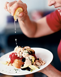 * *Pour* the lemon juice into a large bowl and slowly *whisk* in the olive oil. *Add* the remaining ingredients and *toss* gently.