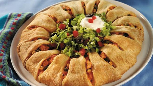 Spoon chicken filling onto widest part of dough. Pull end points of triangles over filling and tuck under dough to form ring. (Filling will be visible.)