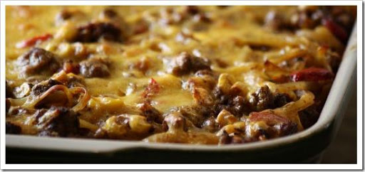 Combine hamburger, onion. Brown and drain. In separate pan, combine soup, Mexicorn, tomatoes and sauce and seasonings. Cook noodles as directed. Combine meat and noodles. Pour tomato mixture over top. Sprinkle with cheese. Bake at 300 degrees for 30 minutes.