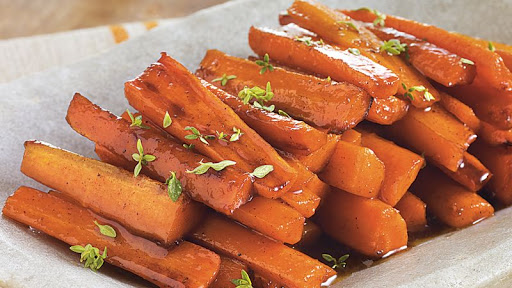 Pour water into skillet. Cover; cook 10 minutes. Stir in brown sugar and vinegar; cook uncovered 8 to 10 minutes or until carrots are glazed and most of liquid has evaporated. Remove from heat; stir in vanilla. Garnish with thyme.