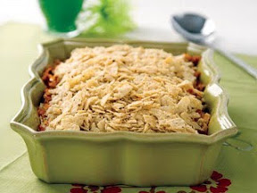 3. Spread one-third of the crushed tortilla chips in the bottom of the prepared baking dish. Spoon hot chicken mixture over chips. Top with remaining one-third crushed tortilla chips.