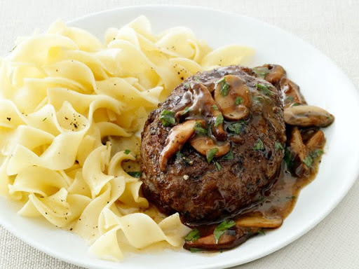 Return the patties and any juices from the plate to the skillet. Simmer until the sauce thickens and the patties are cooked through, about 2 minutes. Sprinkle with parsley and season with salt and pepper. Serve with noodles, if desired.