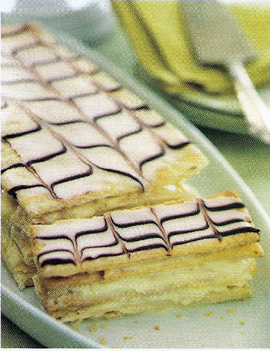 Place one rectangle, cut side up, on platter. Spread with a third of filling. Continue layering with remaining pastry and filling, ending with decorated top. Refrigerate 1 hour. Slice with serrated knife.