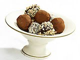 Dip an ice cream scoop into the chocolate and turn upside down to remove excess chocolate. Place truffles 1 at time into the scoop and roll around until coated. Then place the truffle into the dish with either the cocoa powder, nuts or coconut. Move the truffle around to coat; leave truffle in the coating for 10 to 15 seconds before removing. In the meantime, continue placing the chocolate-coated truffles in the cocoa or other secondary coating. After 10 to 15 seconds, remove the truffle to a parchment lined sheet pan. Repeat until all truffles are coated. Allow to set in a cool dry place for at least 1 hour; or store in an airtight container in the refrigerator. Truffles are best when served at room temperature.