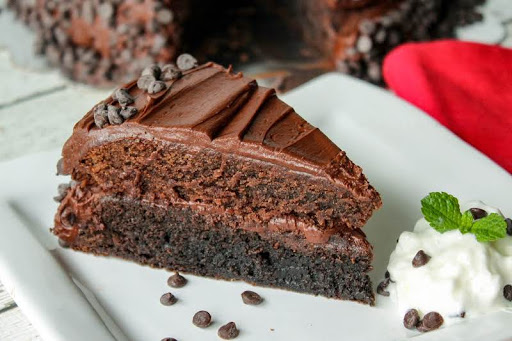 Then pat mini chips to the side of the cake with your hands. Enjoy with whipped cream or alone.