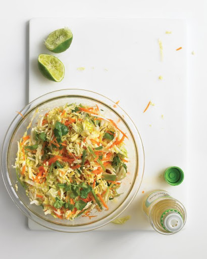 In a large bowl, combine lime juice, rice vinegar, vegetable oil, and sugar; season with salt and whisk. To dressing, add cabbage, cilantro leaves, scallions, carrot, and jalapeno, and toss to combine.