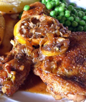 Pour in a good splash of hot water and add lemon slices. Let liquid bubble and reduce down until syrupy, about 10 minutes.