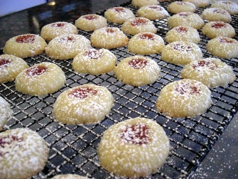 Preheat oven to 350. Let dough soften slightly, roll level teaspoons of it into balls and arrange balls about 2 inches apart on lihtly greased or parchment lined sheets. Using thumb or back of teaspoon measure, make indent. Fill indents with jam. Bake 12-15 min or until pale golden. Let cool 2 minutes, then transfer to rack.