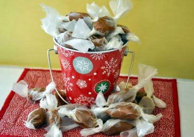 Pour into prepared pan. Allow to cool until able to handle. Cut into one inch squares and place each square (which will look like a blob at this point) in the center of a wax paper square, roll up and twist ends.