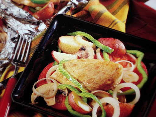 Preheat oven to 450. Cut four 20-inch-long pieces of foil. Divide and layer tomatoes, onions, mushrooms, peppers, and potatoes on each foil piece. Place a chicken breast on each vegetable nest
