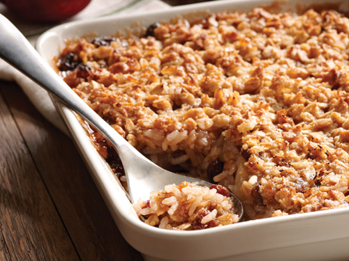 Prepare rice according to package directions. Cool. Preheat oven at 350º F. Spray 8-inch square baking dish with non-stick cooking spray. Combine rice, pie filling, 1/2 cup brown sugar, cinnamon, raisins and walnuts in a medium bowl. Pour into prepared dish. In the same bowl, combine rolled oats and remaining 1/2 cup brown sugar. Cut in margarine with pastry blender or fork, mixing well until mixture is moist. Sprinkle over rice mixture. Bake 20 minutes. Top with ice cream, if desired.