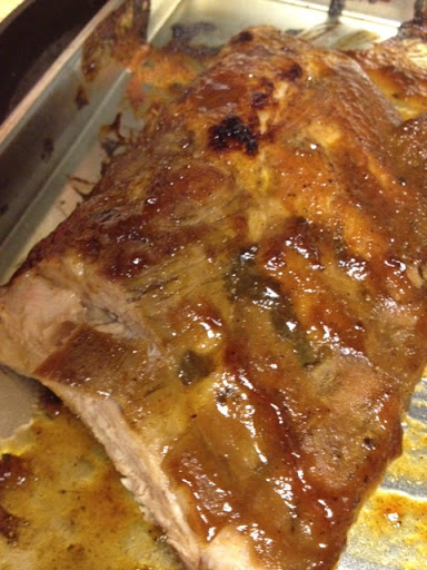 To prepare the ribs, remove the silver skin from the back or under the rib side. Then rub the trimmed rib racks with the spice mixture. Place the racks onto a sheet of plastic wrap, top with the bay leaves and wrap tightly. Place in the oven (the plastic will not melt at this low temperature) and roast for 2 hours.