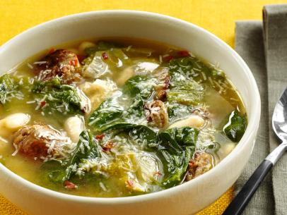 In a soup pot, heat the EVOO, 2 turns of the pan, over medium-high heat. Add the sausage and cook until browned, about 5 minutes. Add the onion and cook until softened, about 2 minutes, then stir in the garlic and cook for 1 minute. Add the beans and escarole; season with salt, pepper and a little nutmeg. Add the chicken stock and 2 cups water, cover and bring to a boil.