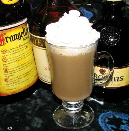 Pour alcohol into a coffee mug, fill to the brim with coffee and top off with some whipped cream.