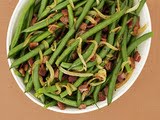 Set a Dutch oven over medium heat and add the olive oil. Once the oil is hot, add the bacon and cook, stirring occasionally, until it is well browned, about 5 minutes. Add the onion and garlic and cook, stirring occasionally, until the onions are translucent, 3 to 4 minutes. Add the green beans and toss to combine with the bacon and onions.