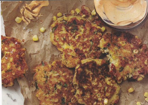 3. Pour 1/4 inch canola oil into a large skillet and heat. Working in batches, fry 1/4-cup scoops of batter until golden, turning once, about 4 minutes total; transfer to a paper towel-lined plate. Serve hot fritters with spicy mayonnaise.