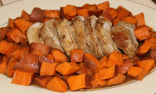 5. Arrange sweet potatoes around edge.