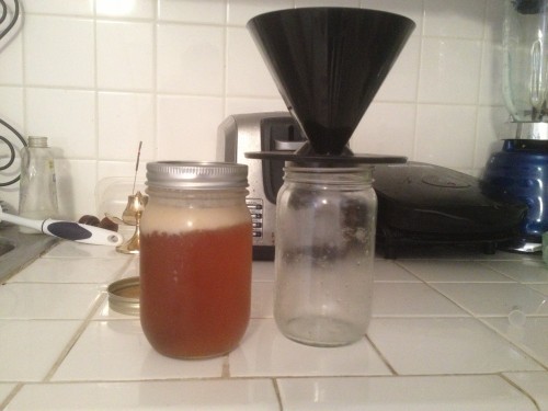 Filter out the residual fat by pouring the mix through a coffee drip/filter into another container.