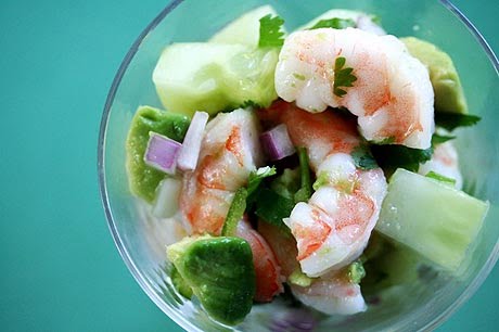 With the warm days of summer upon us, a great way to cool off is with ceviche. Ceviche is typically made with red snapper that is "cooked" by the acidity of lime and lemon juice (see this ceviche recipe.) This version is prepared with shrimp, which is first lightly cooked, and then marinated in the citrus juice. My father, who generally doesn't really like shrimp that much, loved this ceviche. (Gotta love it when they eat it up and ask for more.)