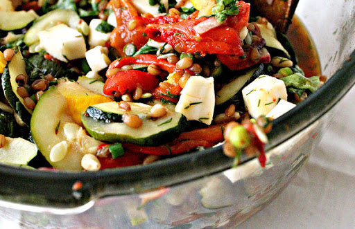 3. Toss together the zucchini, wheat berries, roasted red peppers, radishes, lettuce, and dill in a large salad bowl. Add the vinegar and remaining oil. Sprinkle with salt and pepper and toss again. Taste and adjust the seasoning. Toss with mozzarella.