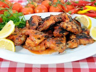 Remove wings from marinade (reserving marinade). Place wings on grill, away from coals. Close cover and cook wings for 30 minutes turning and rearranging once.