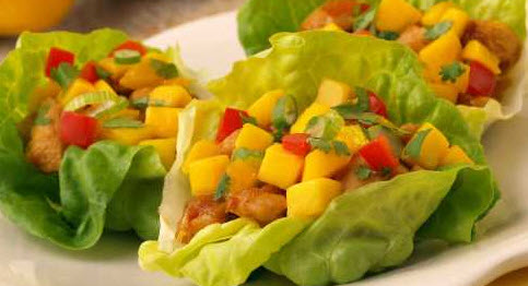 • Spoon chicken into lettuce leaves and top each with remaining mango, bell pepper, green onion and cilantro.