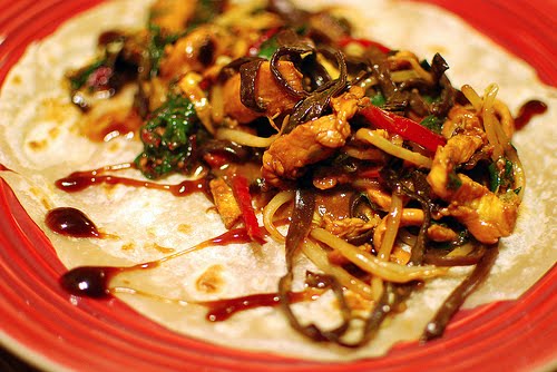 Whisk cornstarch, soy sauce, dry sherry and hoisin sauce. Heat the canola oil and stir fry garlic and ginger. Add coleslaw and scallions until wilted, about 3 minutes. Add chicken and soy sauce mixture. Toss until heated and drizzle with sesame oil. Serve in warmed flour tortilla. Add additional hoisin sauce if desired.