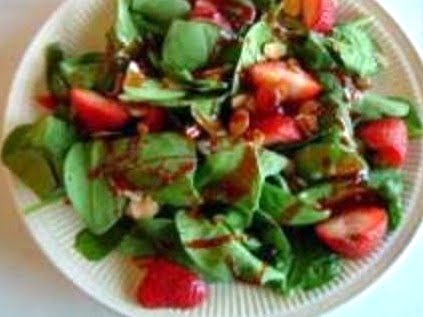 Set dressing aside. In a salad bowl, combine the spinach, hearts of palm, strawberries, and walnuts. When ready to serve, add some of the dressing, and toss gently.
