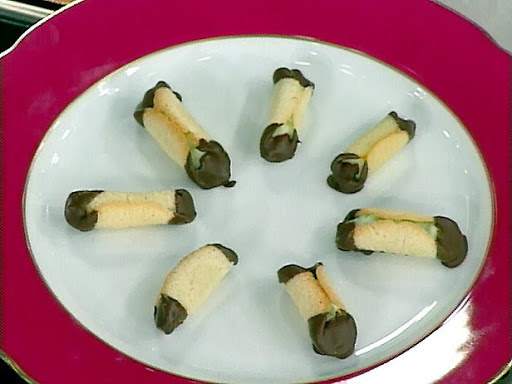 While the cookies are baking, place a folded kitchen towel (a smooth, untextured towel, no terry cloth) on your countertop. One at a time, lift each cookie off the baking sheet using a metal spatula and place it upside down on the towel. Roll it around a wooden dowel or metal rod to form a cigarette. As you finish rolling the cigarette, press down firmly on the dowel to prevent the cigarette from unrolling, then slide it off the dowel onto a plate. Work quickly because if the cookies cool they will become brittle. If they do cool and start to crack as you roll them, return the baking sheet to the oven briefly to reheat them. Storage: Covered airtight in a cookie jar or tin cookie bowl for up to 1 week. Pipe the filling into both ends of the each cigarette to fill the entire length. Dip 1 end of each cigarette in the chocolate, clean off the excess on the edge of the pot, and place the cigarette on a sheet of waxed paper until the chocolate sets. Then dip the other end of each cigarette in the chocolate, clean off the excess on the edge of the pot, and return to the sheet of waxed paper until the chocolate on both ends has set. Serve on a serving platter.