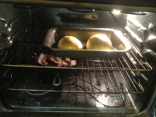 3)Cut spaghetti Squash in half, scoop out seeds and stringy looking pulp and coat with bacon fat