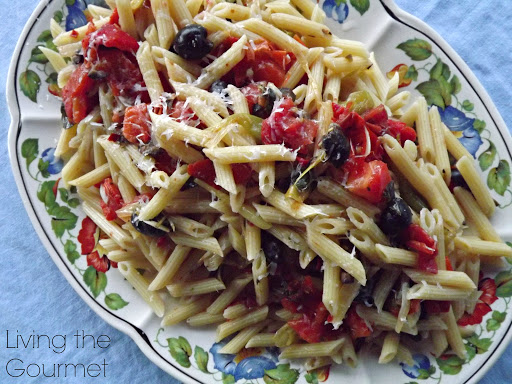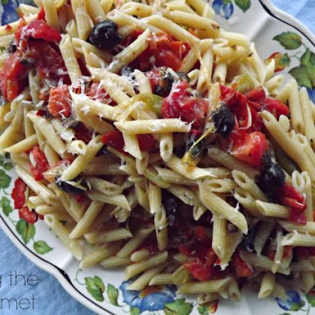 Heat a large frying pan with 2 tablespoons of olive oil. Add the scallions, garlic and tomatoes. Sauté on low until the scallions are tender. Add the olives, basil and seasonings. Gently simmer while preparing the macaroni.
