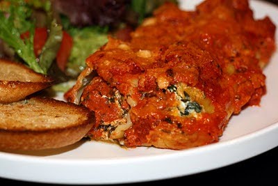 Meanwhile, in a medium bowl, combine ricotta, 1/2 cup Parmesan, and lemon zest. Stir in spinach and season filling to taste with salt and pepper. Transfer filling to a zip-top plastic bag. Twist and squeeze bag so filling is in one corner.