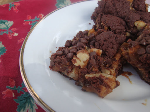 Combine dry cake mix, butter, milk, and nuts. Stir until dough holds together. Press half of dough in pan. Bake at 350° for 6 minutes. Sprinkle chocolate chips over baked crust. Spread caramel mixture over chips. Drop rest of dough over caramels. Bake 15-18 minutes more. Cut when cool.