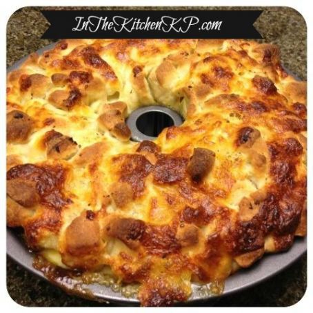4. Layer dough pieces in bottom of bundt or fluted tube pan, next layer sliced pepperoni, shredded cheese and sprinkle with garlic powder. Repeat all three layers again in the same order, and then end with final layer of dough pieces.
