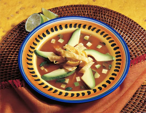 To serve, add the chicken and avocado to the soup and reheat over low heat. Ladle the soup into 6 to 8 warm soup blows and garnish with the bake tortilla strips. Cheddar cheese, and chopped cilantro.