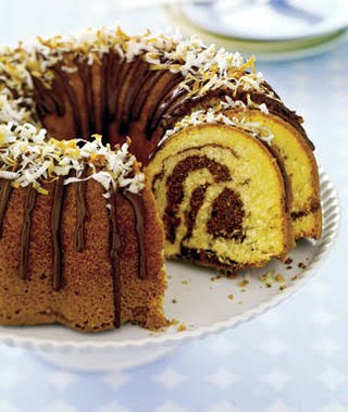 5. Stir coconut into remaining batter. Spoon 2 cups into prepared pan. Drop spoonfuls of chocolate batter into pan, leaving spaces between each dollop. Drop spoonfuls of coconut batter between chocolate batter. Repeat, alternating batters. Run a knife through batters to marbleize.