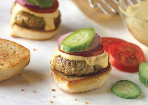 Dinner rolls work well as buns for these mini burgers. Allow three burgers per person and top with tomato, red onion, and cucumber slices.