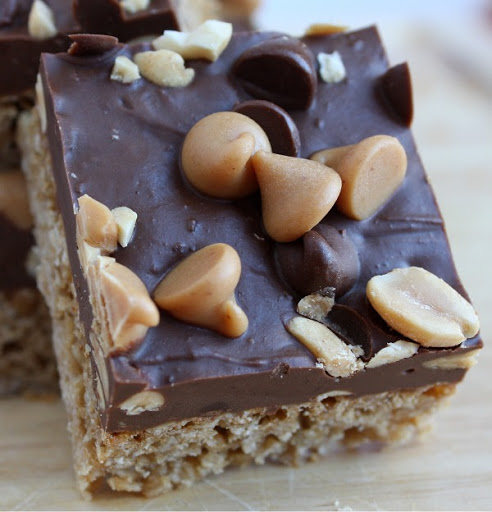 * Sprinkle chocolate and peanut butter chips and peanuts over the top; press lightly into the chocolate layer.