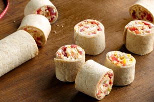 Mix neufchatel, chiles and cumin; spread onto tortillas. Top with remaining ingredients. Roll up tortillas tightly. Cut each crosswise into 5 slices.