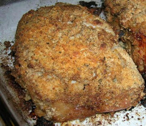 Whisk all ingredients together except bread crumbs until you have a smooth sauce. Dip each chop in liquid and then in bread crumbs. Bake in preheated 375 degree oven for 45 minutes or until chops are done in the middle.