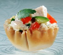 In a small bowl combine chicken, avocado, tomato, green onions, jalapeño, mayonnaise, vinegar, cilantro and salt mixing well. Chill for 1 hour. Place 1 rounded tablespoon of mixture into each Fillo Shell. Garnish each with a sprig of cilantro. Serve immediately.