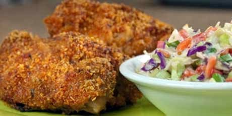 The Podleski sisters promise that this extra-crispy seasoned coating makes this oven-fried chicken taste better than its high-fat, deep-fried cousin. They deliver once again Average fat content per piece is 258 calories and only 8.8 gms of fat.