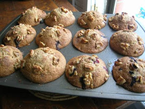 In a mixing bowl, mix eggs, sugars, oil, vanilla with mixer. Add flour, spices and remaining ingredients except blueberries and nuts and continue mixing. Fold in blueberries. Spray a 12 cup muffin pan or use paper muffin cups. Fill almost to the top of each cup with muffin mixture. Once you fill the cups mix some sugar and cinnamon together and sprinkle on top of the muffins. If using nuts, sprinkle them on top, too. I used walnuts and just put a few pieces on top of each muffin after sprinkling with sugar and cinnamon. Bake in preheated 400 degree oven 20 to 25 minutes. Let cool 10 minutes. Makes 12 large muffins. Enjoy!