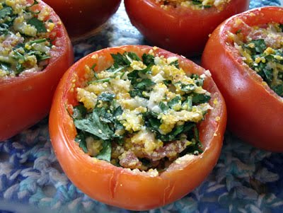 Cut a slice off stem end of tomato. Scoop out pulp. Place bacon in flat glass casserole. Cover with paper towel. Microwave on high 4 to 5 minutes. Remove bacon with slotted spoon. Set aside.