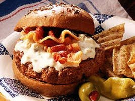 3.Place burgers on bottom half of buns. Spoon dressing onto burgers; top each with 2 pieces of bacon. Top with top half of buns.