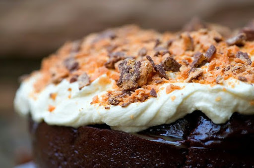 Do the same with the caramel ice cream topping. Sprinkle on some of the broken candy pieces. When it's cool, spread the Cool Whip topping on the top, and then sprinkle the rest of the broken bars. Then drizzle more caramel all over and then drizzle chocolate syrup all over in zig zags.