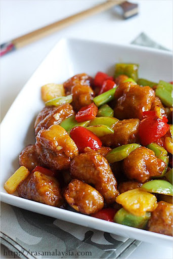 Combine meat, 1 Tbsp corn starch, and 1 Tbsp soy sauce. Combine pineapple juice, 1 Tbsp corn starch, 2 Tbsp soy sauce, vinegar, sugar, ketchup, and hot sauce. Heat oil and saute meat. Add the onion, ginger, garlic, and pepper. Stir 3 minutes or until meat is cooked. Add wet mixture and boil.