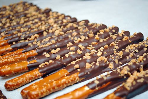 While chocolate is still wet, sprinkle toffee bits over the pretzel and allow to dry and harden. Package when pretzel is completely dry.