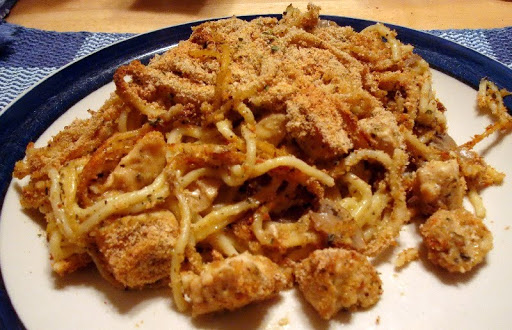 Add olive oil to the bottom of a large skillet. Add basil, Nature Seasons and thyme to the chicken breasts. Cook the seasoned chicken cubes over MEDIUM heat until there is no pink in the center. Cook the pasta according to the package directions; Drain. To a large casserole dish, add the Cream of Chicken soup, water, mushrooms and peas; Mix together until the soup mixture is smooth with no remaining lumps. Add the cooked pasta and cooked chicken cubes; Toss the mixture until everything is blended together. Sprinkle seasoned bread crumbs over the top of the dish. Bake the casserole, uncovered, at 400 degrees Fahrenheit for 45 minutes to 1 hour. This recipe serves 4 people.