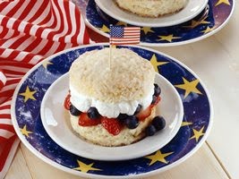 To serve, split biscuits; place on 8 dessert plates. Layer each with strawberries, blueberries and whipped cream.